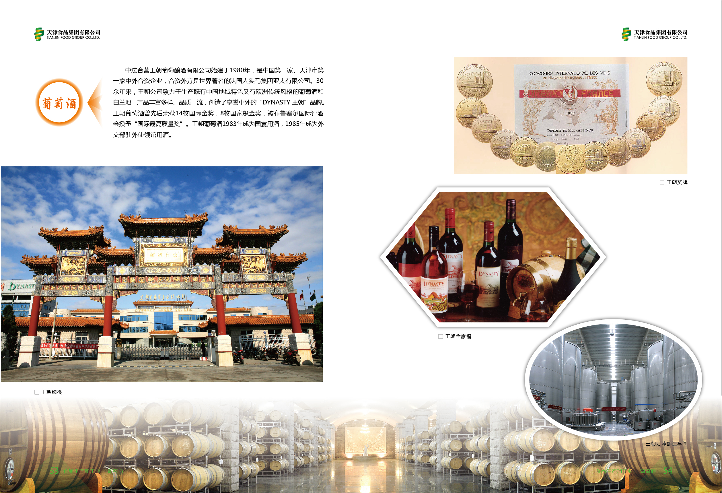 中法合营王朝葡萄酿酒有限公司始建于1980年,是中国第二家、天津市第一家中外合资企业。近40来,王朝公司致力于生产既有中国地域特色又有欧洲传统风格的葡萄酒和白兰地,产品丰富多样、品质一流,创造了享誉中外的“DYNASTY 王朝”品牌。