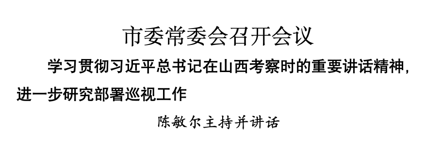 本报讯(记者 于春沣 刘国栋)7月13日,市委常委会召开会议,学习贯彻习近平总书记在山西考察时的重要讲话精神,进一步研究部署巡视工作。市委书记陈敏尔主持会议并讲话。