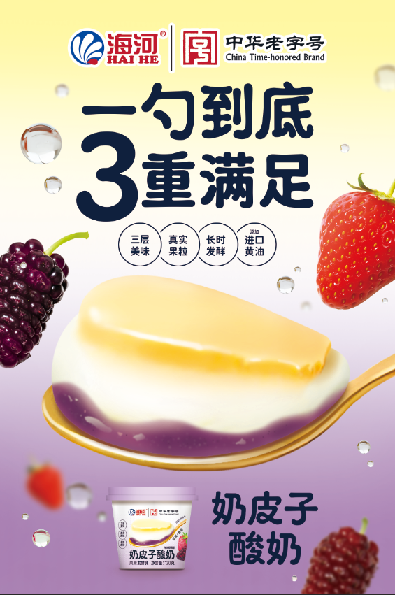 轻轻揭开杯盖,来一场舌尖上的立体穿越。启程于凝脂般金黄浓醇的奶皮子,特选进口黄油在单杯慢发酵时光中凝萃的精华,每一口都是浓郁的脂香序曲。勺子如探险家般向下穿梭,触达雪白柔滑的酸奶腹地,自然发酵的清新酸香温柔承接。而旅程的高潮,在杯底热烈绽放,大颗草莓与桑葚果粒浸润在绛紫色果酱中,如同埋藏的味觉宝藏。一勺到底,不是简单的分层品尝,而是一次从浓郁奶脂、清新乳香到鲜活果粒爆浆的完整味觉叙事,金黄、雪白、绛紫在口中奏响出层次分明的交响曲。这杯酸奶,让“吃”变成一场奇妙的感官旅程,直接开辟了“果粒奶皮子酸奶”这一全新细分赛道,海河乳品公司也成为该领域无可争议的定义者与领跑者。
