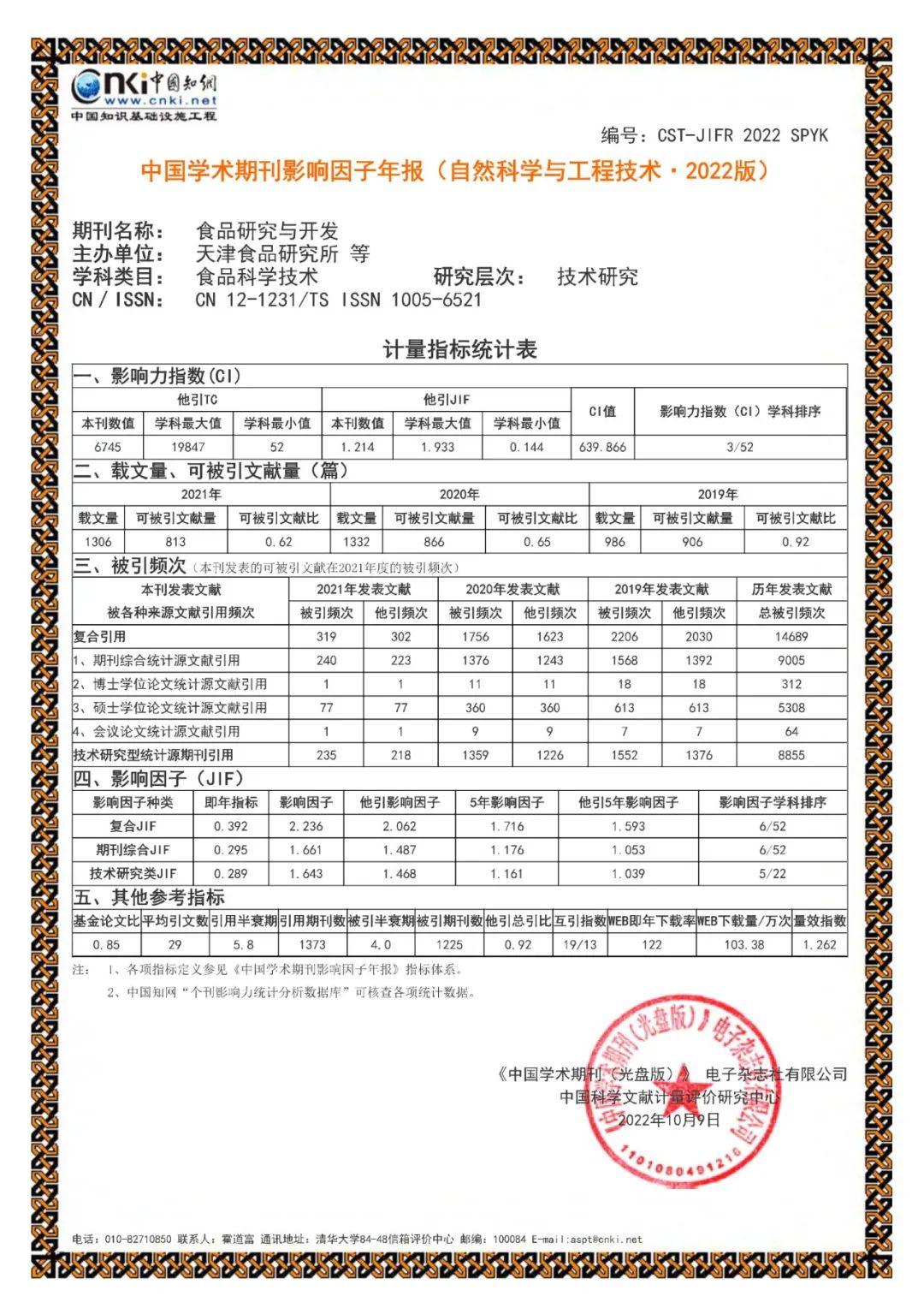 日前,中国学术期刊(光盘版)电子杂志社有限公司、中国科学文献计量评价研究中心编制出版的《中国学术期刊影响因子年报(自然科学与工程技术·2022版)》正式发布。食品集团主管,天津市食品研究所主办的期刊《食品研究与开发》的影响力指数稳居本学科第三位。