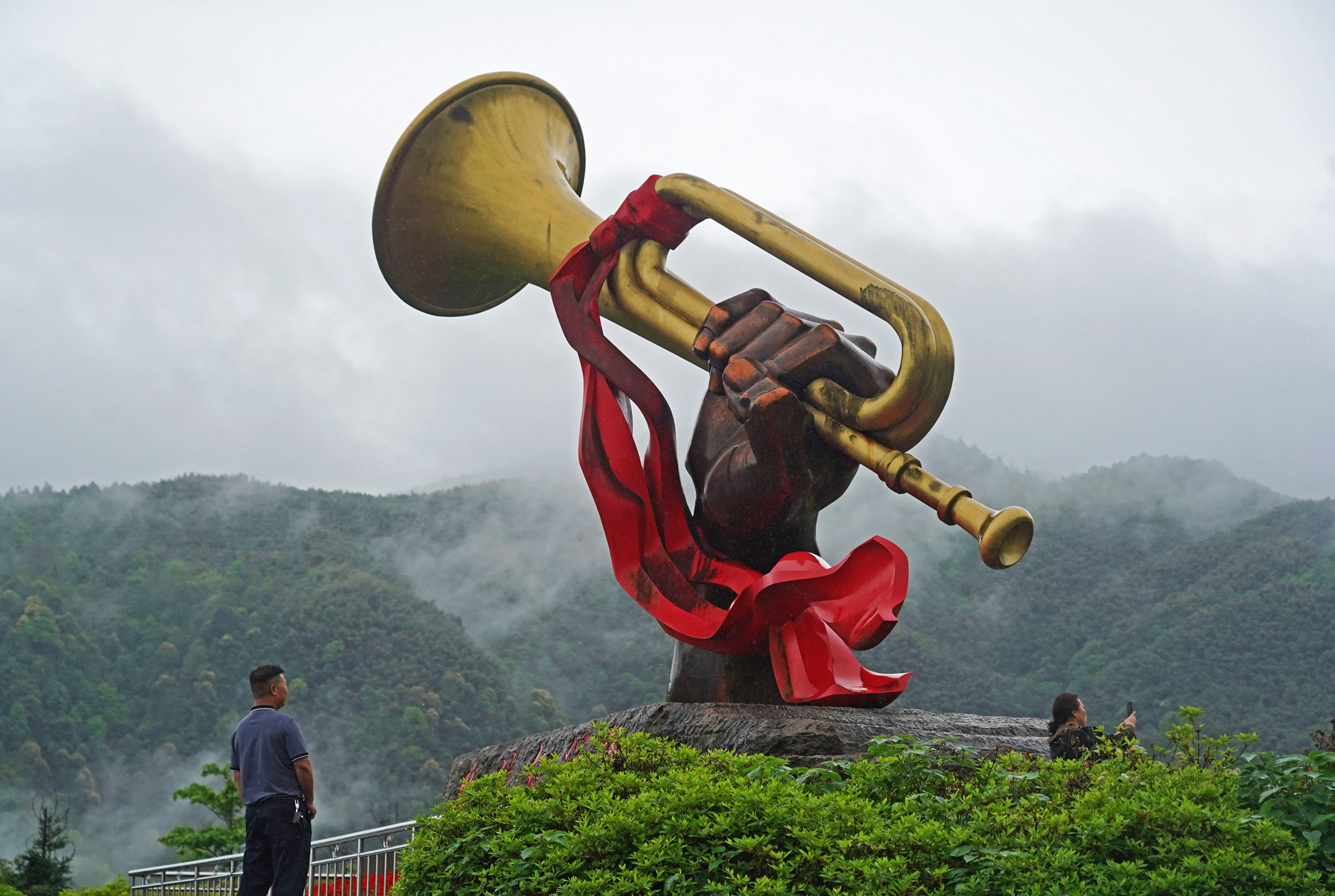 游客在井冈山参观“胜利的号角”雕塑(2021年4月27日摄)。新华社记者 万象 摄